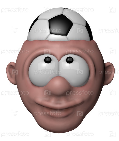 Мультипликационный персонаж с футбольным мячом в голове. 3d иллюстрация