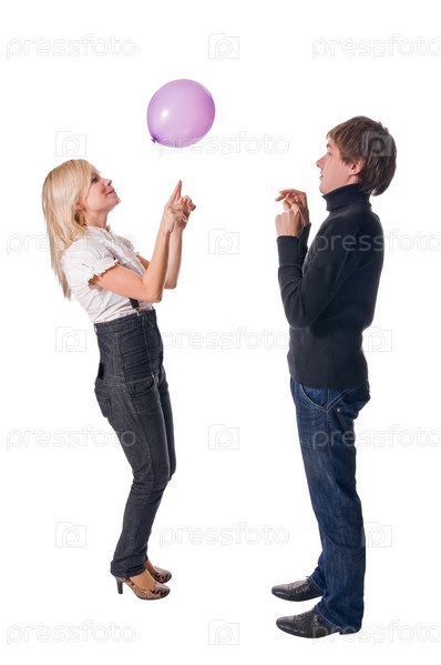 Молодая пара играет с воздушным шариком на белом фоне