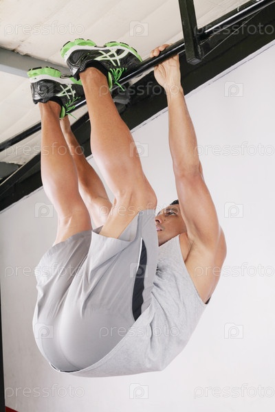 Спортсмен выполняет трудное упражнение, спортивная гимнастика