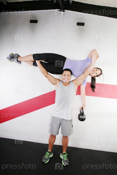 Мужчина поднимает красивую женщину в тренажерном зале