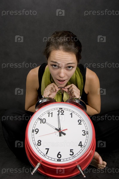 Портрет молодой девушки с большим будильником