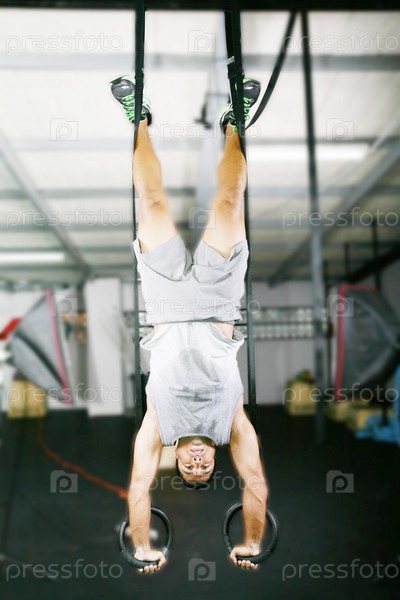 Спортсмен выполняет трудное упражнение, спортивная гимнастика