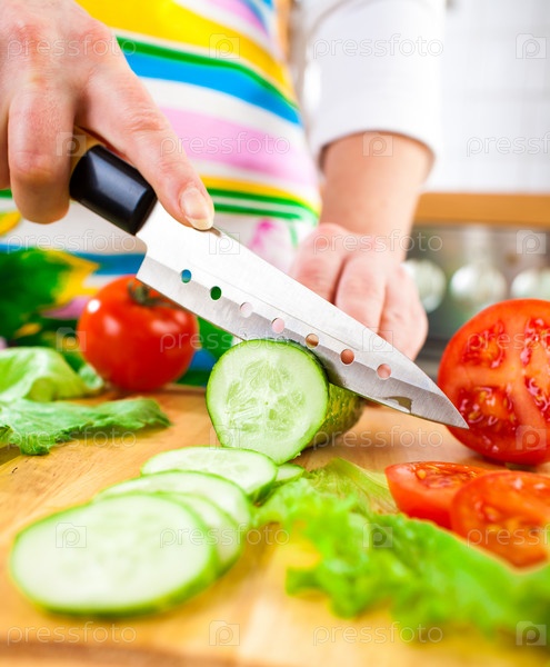 Женщина режет огурец