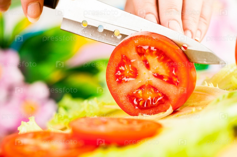 Женщина режет помидор