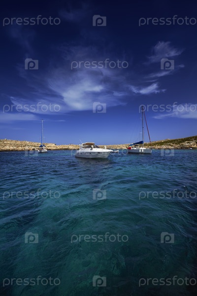 Мальта, побережье южной части скалистого острова Комино и яхта в Голубой Лагуне