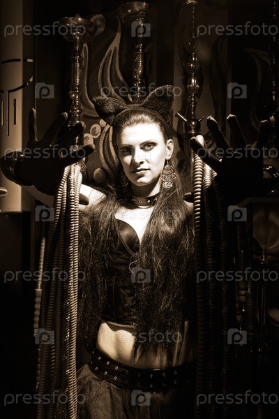 Привлекательная женщина в костюме кошки предлагает кальян