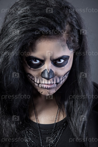 Молодая женщина фейс-артом черепа на Хэллоуин