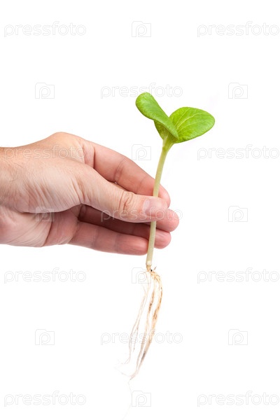 Мужская рука держит небольшой росток