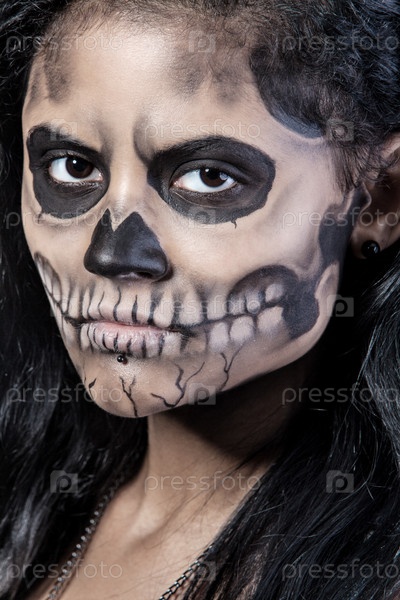 Молодая женщина фейс-артом черепа на Хэллоуин