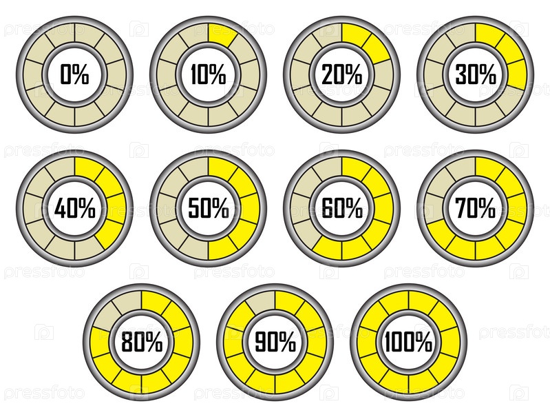 Набор из желтых круглых шкал прогресса с десятью секторами