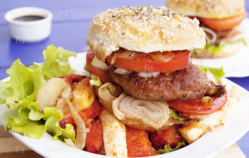 Аппетитный бутерброд с жареным мясом и печеными овощами