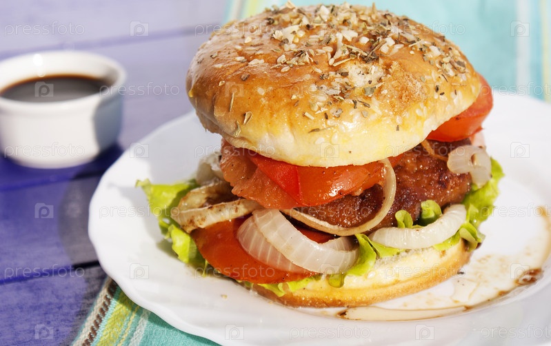 Аппетитный бутерброд с жареным мясом и печеными овощами