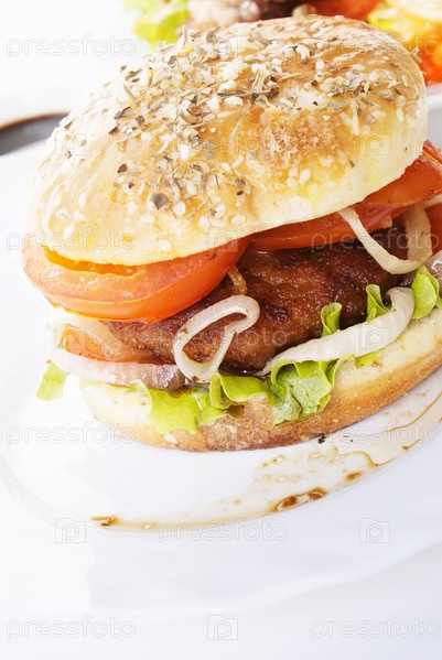 Аппетитный бутерброд с жареным мясом и печеными овощами