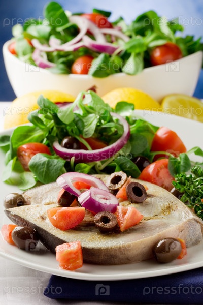 Рыбба меч, приготовленная на гриле, с листьями салата