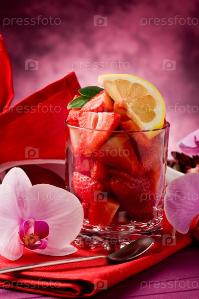 Клубника с орхидеей на красном столе