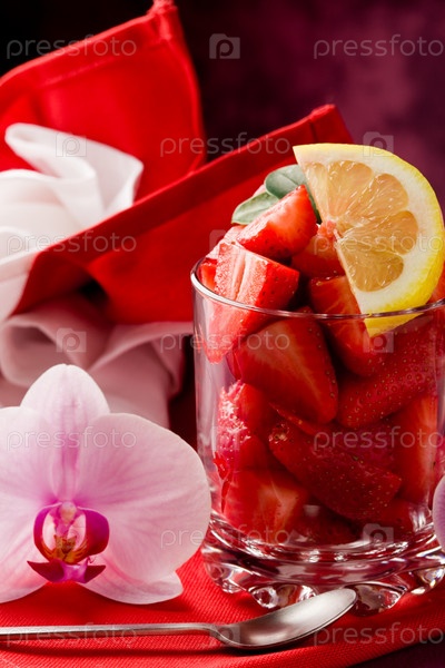 Клубника с орхидеей на красном столе