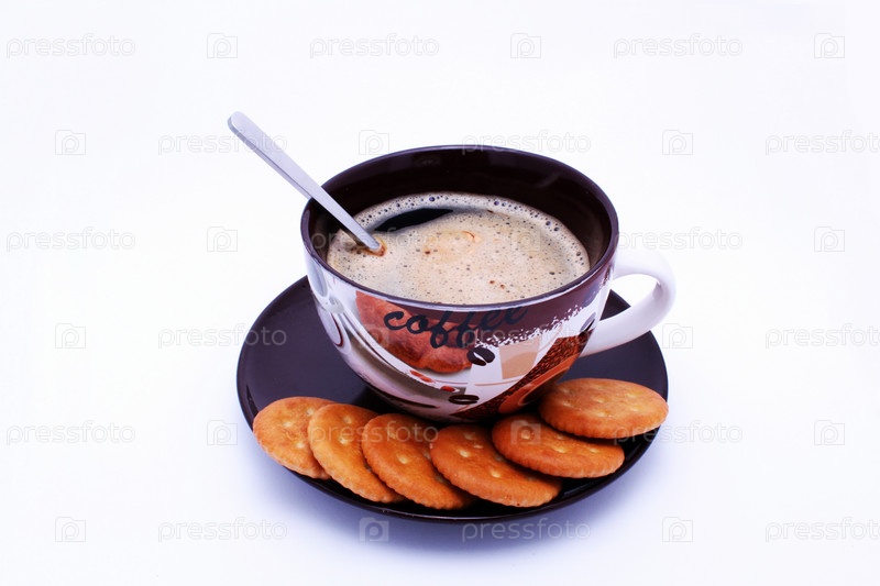 Чашка кофе и крекеры, изолированные на белом