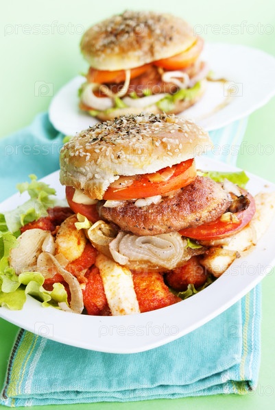 Аппетитный гамбургер с жареным мясом и печеными овощами