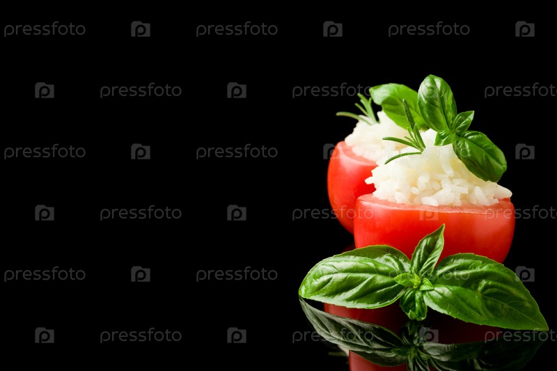 Помидоры с рисом, изолированные на черном фоне