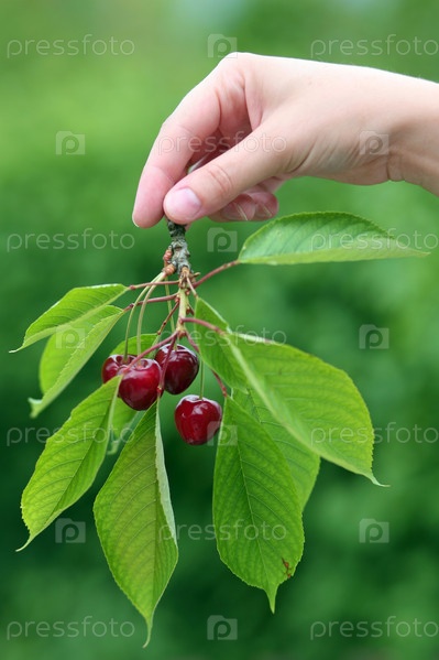 Женская рука с веткой вишни