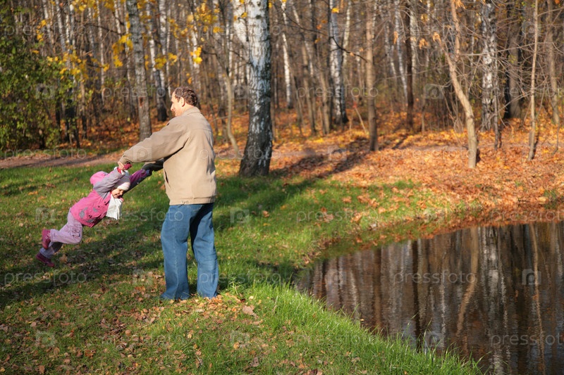 Дед гуляет с внучкой в лесу возле пруда