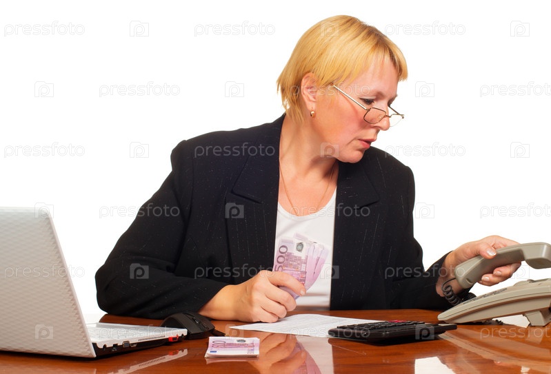 Взрослая бизнес-леди с телефоном и банкнотами евро