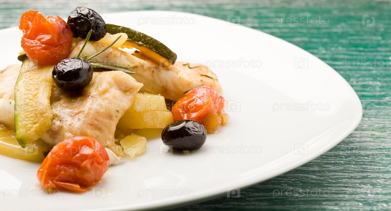 Треска, запеченная с оливками и помидорами