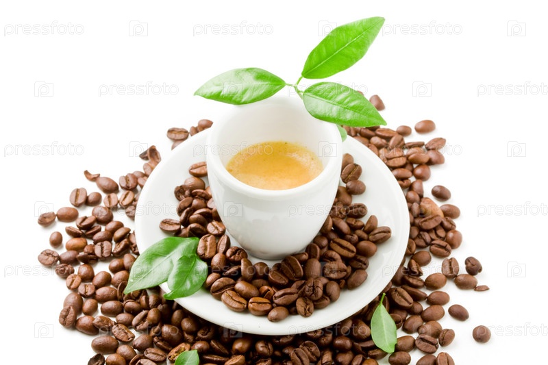 Эспрессо с зелеными листьями на белом фоне