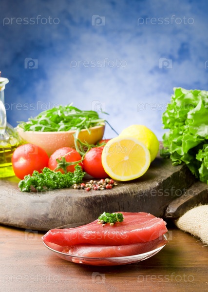 Сырой стейк из тунца с ингредиентами