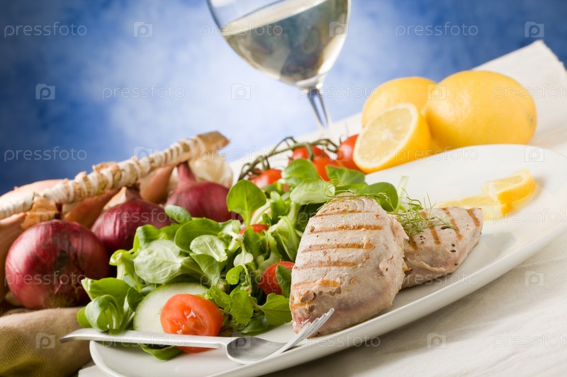 Жареный стейк из тунца с салатом