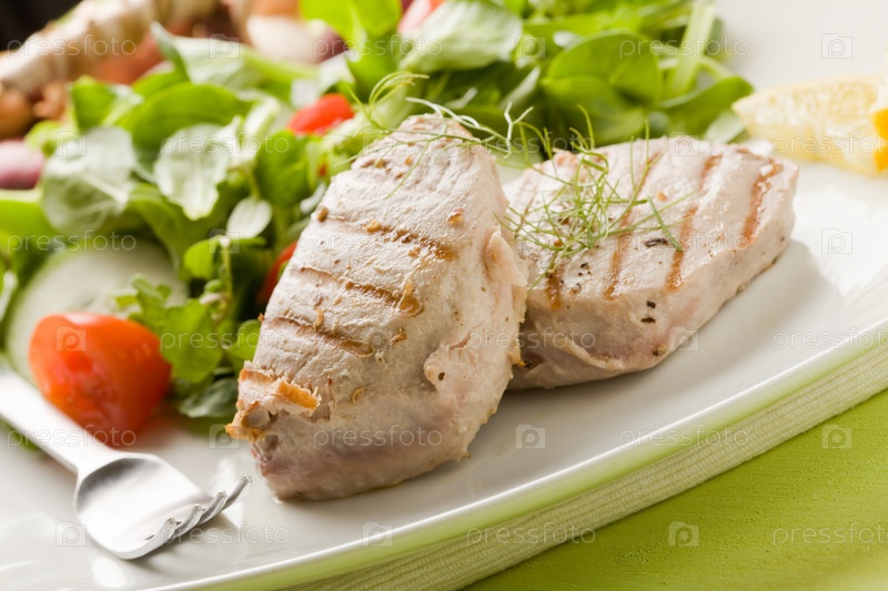 Жареный стейк из тунца с салатом
