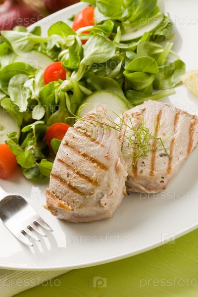 Жареный стейк из тунца с салатом