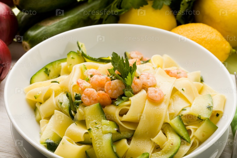 Макароны с креветками и цукини