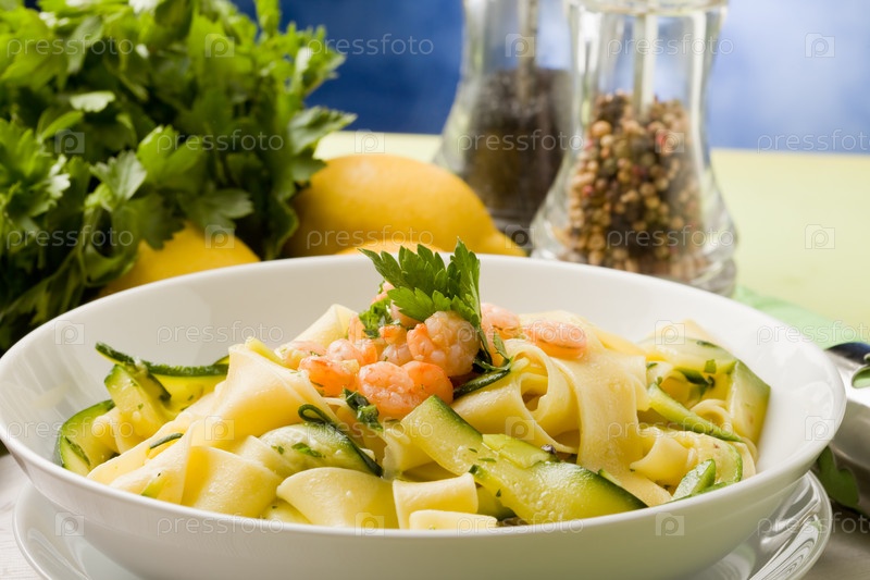 Макароны с креветками и цукини