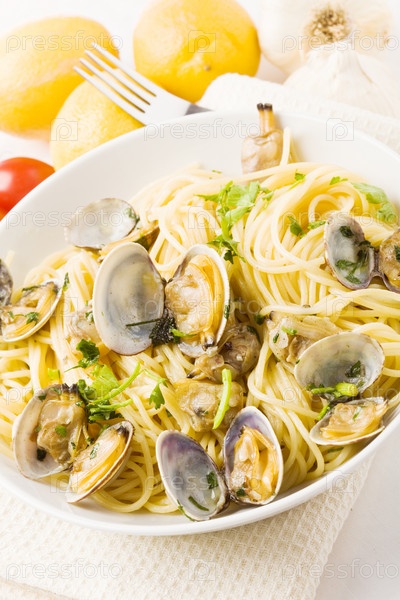 Макароны с моллюсками на белом фоне