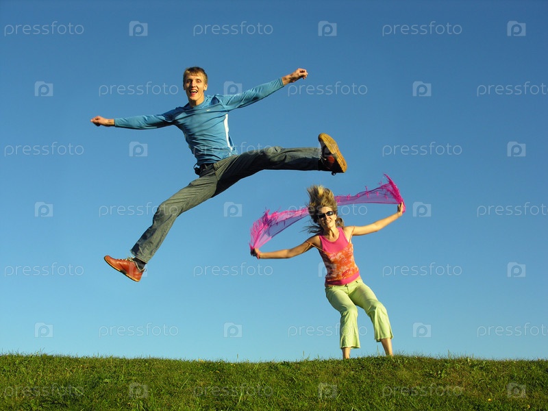 Пары прыгают на траве