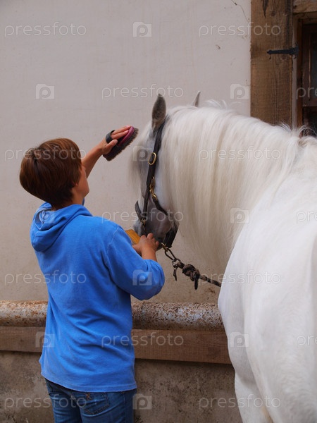Женщина чистит лошадь