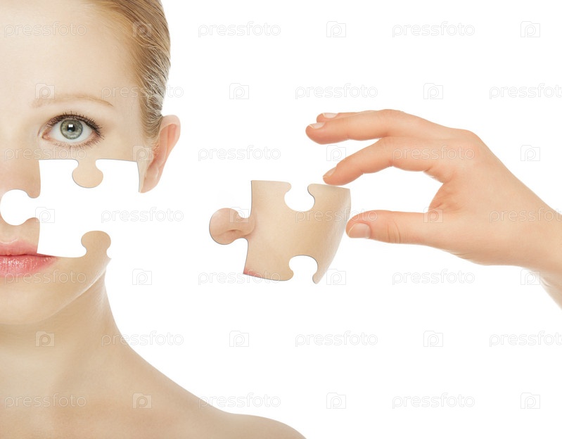 Концепция ухода за кожей с пазлами. Кожа молодой женщины до и после процедуры