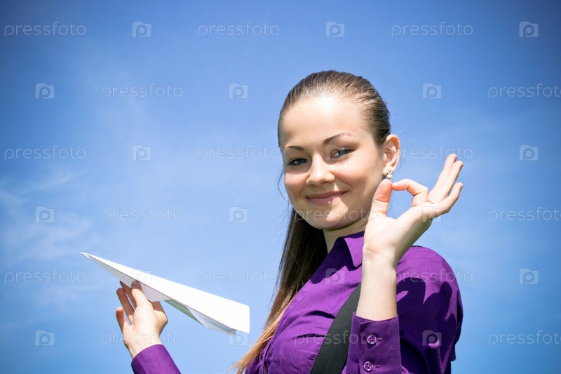 Девушка с бумажным самолетиком в руках