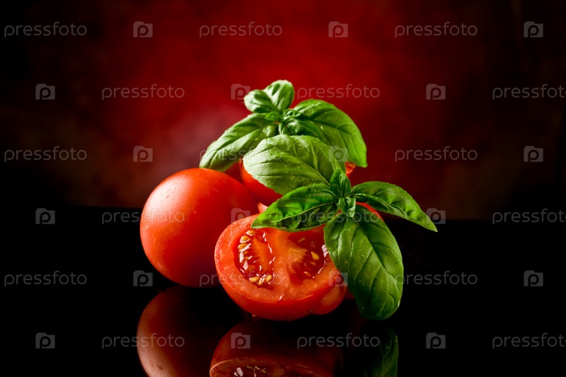 Нарезанные помидоры с базиликом на стеклянном столе