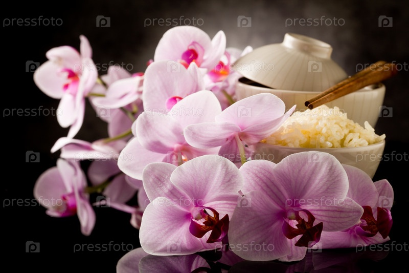 Блюдо азиатского риса с цветами орхидеи