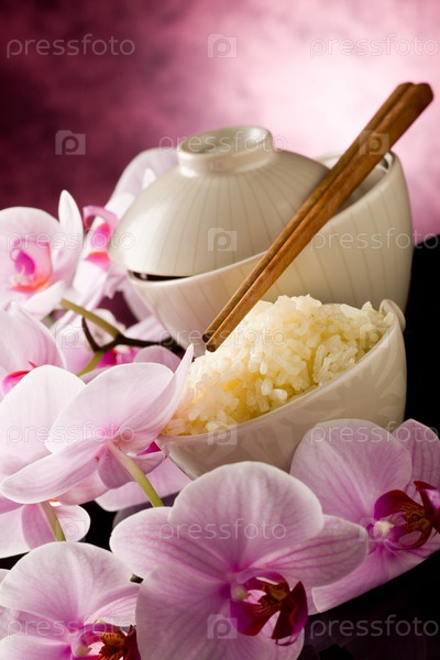 Блюдо азиатского риса с цветами орхидеи