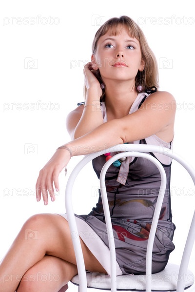 Портрет красивой девушки, сидящей на стуле на белом фоне