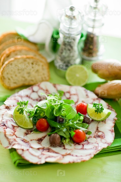 Карпаччо из осьминога с листьями салата