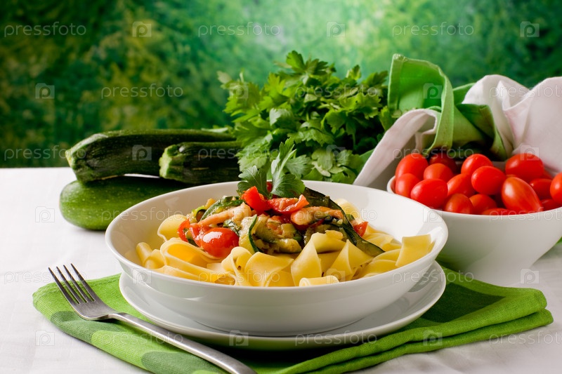 Макароны с креветками и цуккини