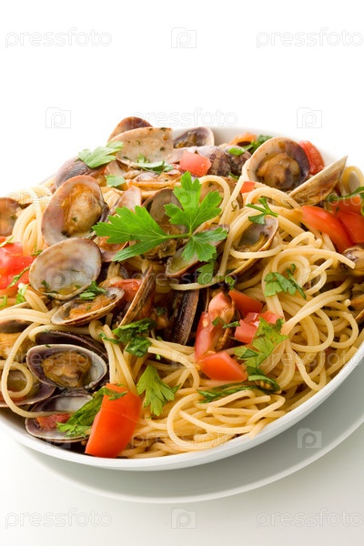 Макароны с моллюсками на белом фоне