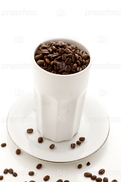 Кофе в зернах в белом стакане, изолированном на белом фоне
