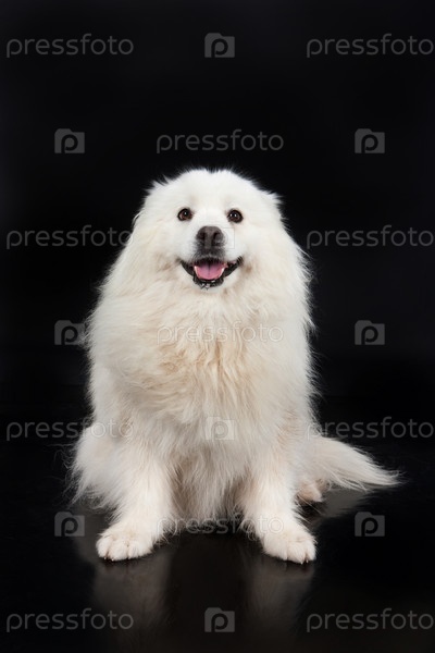 Белая самоедская лайка на черном фоне