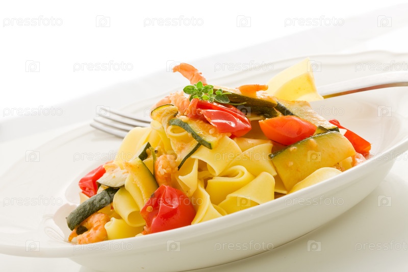 Макароны с креветками и цукини