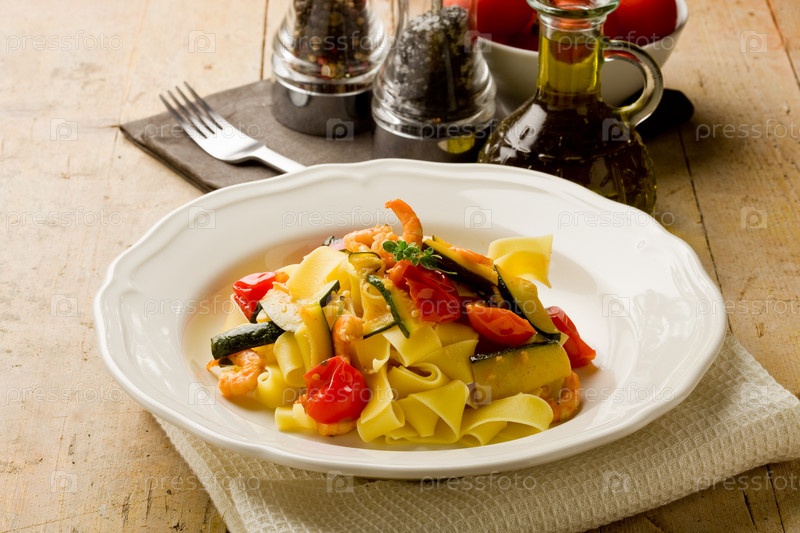 Макароны с креветками и цукини
